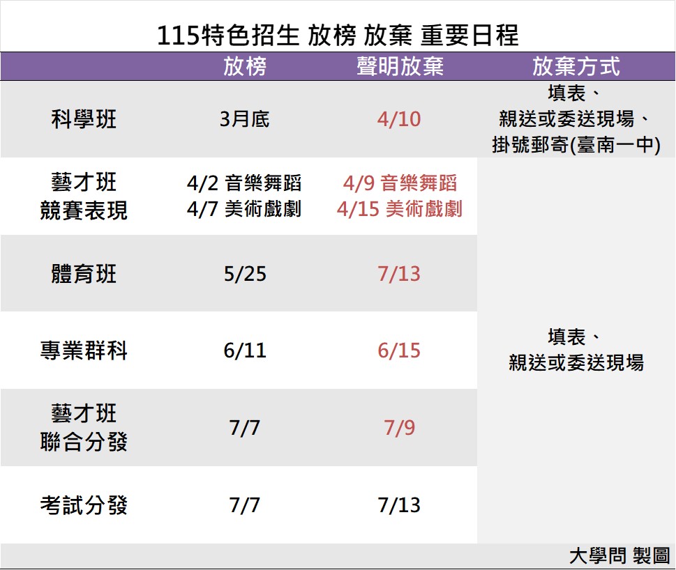 115年特色招生甄選入學包括:「科學班」、「藝才班」(音樂、美術、舞蹈、戲劇)、「體育班」、「專業群科甄選入學」、「考試分發」等管道,其中以「科學班」最早於4月8日報到,「體育班」5月25日放榜,「專業群科」6月11日放榜,最晚的則是「藝才班」聯合分發和「考試分發」,於7月7日放榜。