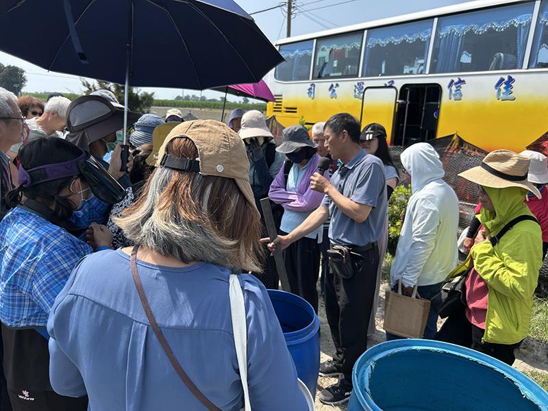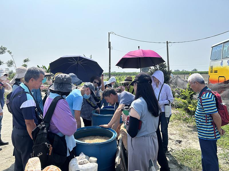圖03.南華大學科技學院舉辦KKF自然農法推廣活動,參與學員實地觀摩微生物菌水培養過程,了解有機資材轉化與農業廢棄物再利用技術。