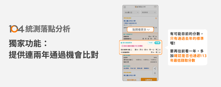 此外,104獨家功能:提供連兩年通過機會比對。一般落點分析只看是否通過去年標準,但每年的考試難易度不同、招生人數、熱門科系都會變動,如果你的分數連續兩年都能通過,代表通過今年一階篩選的把握度更高!