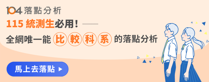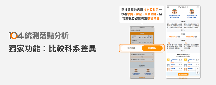 A:免費。與其他統測落點工具相比,104 統測落點分析獨家提供「近兩年通過機會比對」與「比較科系」功能,可在同一頁面查看課程、學費與畢業出路、薪資差異,幫助高職生一站完成選填志願的決策。