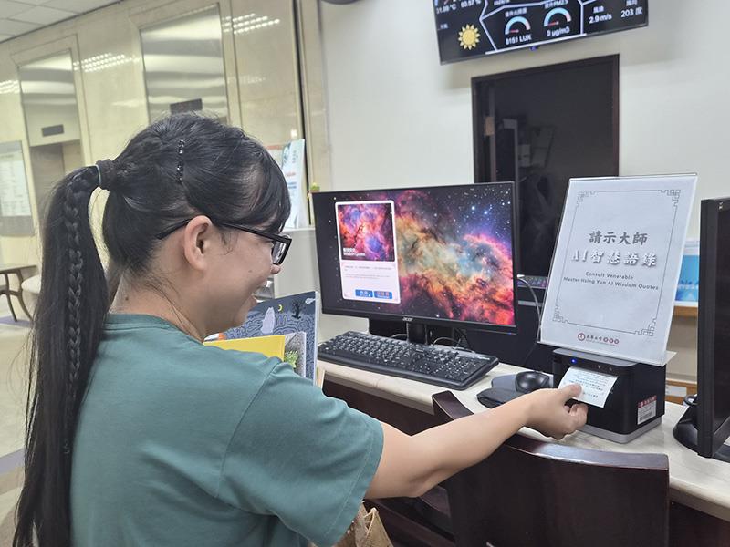圖01.南華大學響應世界閱讀日,辦理系列創意活動推廣閱讀。學生體驗「AI智慧語錄」機,抽取星雲大師智慧法語。