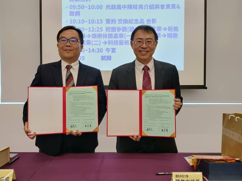 醒吾科大陳義文校長(右)、光啟高中陳成業校長(左)共同簽約