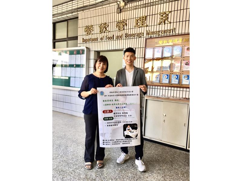 餐管系老師徐珠璽(左)感謝校友徐翊倫返校與學弟妹分享就業經驗