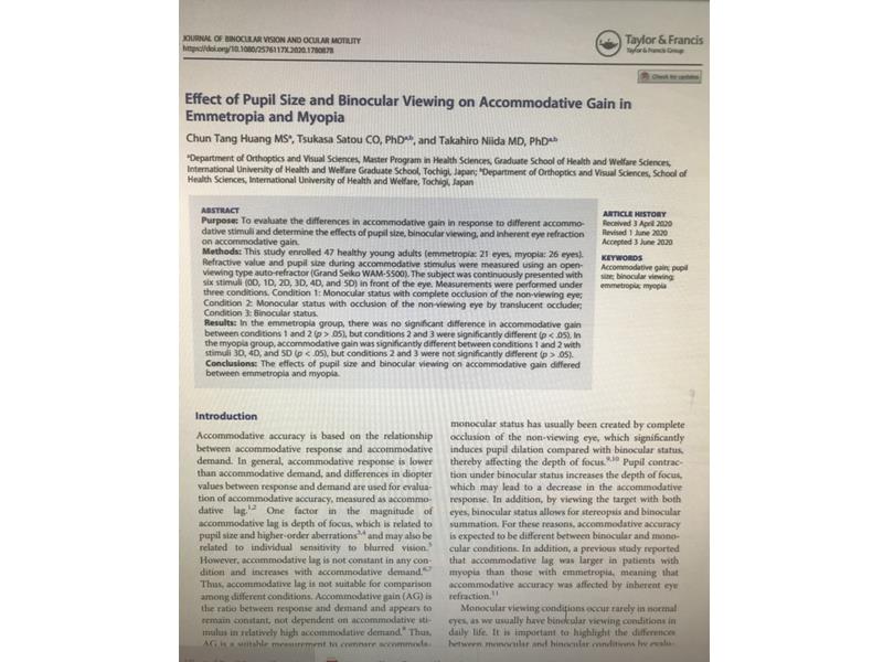 黃俊棠在日本國際醫療福祉大學視機能療法學科的碩士論文”Effect of Pupil Size and Binocular Viewing on Accommodative Gain in Emmetropia and Myopia”7月2日剛被國際期刊 “Journal of Binocular Vision and Ocular Motility”刊登,該校副校長新井田孝裕隨其傳訊通知元培國際長黃曉令這個好消息,兩校姐妹校情誼深厚、對此也同感榮耀。