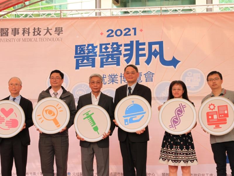 畢業前夕,新竹市首場校園就業博覽會在元培醫事科大登場,(左起)元培副校長周宜宏、新竹市政府勞工處洪俊耀副處長、元培蔡世傑副校長、勞動部勞動力發展署桃竹苗分署賴家仁分署長、新竹就業中心陳玉秋主任、新竹縣政府勞工處劉彥誠科長等人共同開幕