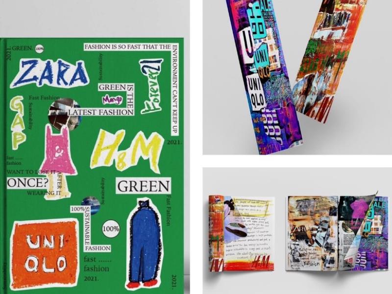作品之二:GREEN FASHION,商設系廖怡雯(醒吾科大觀光休閒系五專部畢業)設計概念以拼貼手法,探討平價時尚背後的浪費、剝奪和不環保,也有些品牌正在打破「不環保印象」,安靜的環保革命進行。