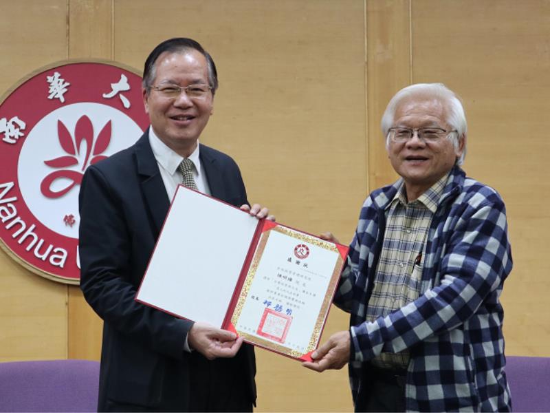 南華大學辦理企業經營與人文講座,邀請台北經營管理研究院陳明璋院長(右)蒞校演講,林辰璋副校長(左)致贈感謝狀。