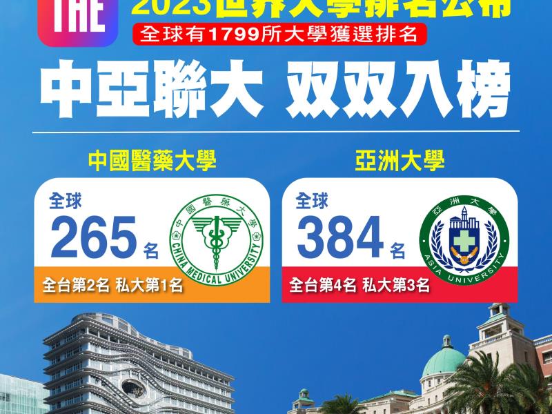 英國「泰晤士報高等教育」特刊(THE)公布2023世界大學排行榜,台灣有11所大學入榜前1000排名,其中「中亞聯大」系統大學的中國醫藥大學、亞洲大學均入榜,中醫大排名世界第265名、全台第2名、私大第1;亞大排名世界第384名、全台第4名、私校排名第3、非醫學類私大第1,較去年進步202名,排名大躍進。