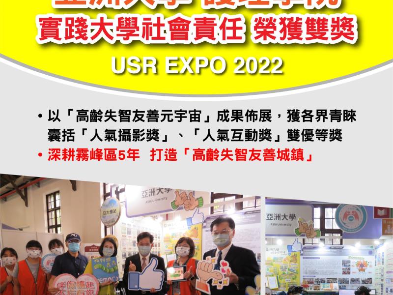 「2022大學社會實踐USR博覽會」(USR EXPO),11月20日在台北松山文創園區舉行,亞洲大學護理學院以「打造高齡失智友善城鎮:失智識能x瑞智升級x智能輔助」計畫,深耕台中市霧峰區5年,在展場以「高齡失智友善元宇宙」成果為主題十分吸睛,榮獲「人氣攝影獎」、「人氣互動獎,雙「優等獎」殊榮!