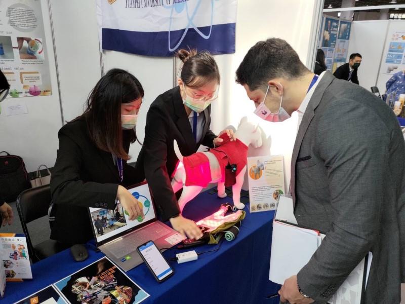 寵保系林育興老師團隊指導寵保系、生技製藥系及醫管系學生「光照理療裝置」,在寵物軀幹部、腹部及後肢部的穴位進行壓痛點及針灸穴位刺激,可有效降低關節炎的疼痛。