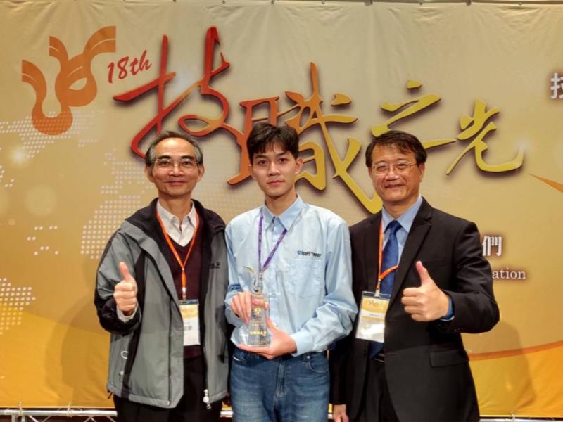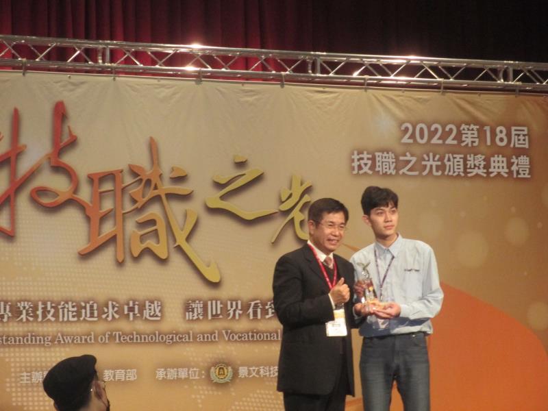 教育部為鼓勵技職校院師生踴躍參與國際性技藝能競賽和專業證照檢定,特別為這些領域具有傑出表現的師生,設置技職校院最高榮譽-「技職之光」,並由教育部部長親自頒獎。今年「2022第18屆技職之光」頒獎典禮於12月29日假集思交通部國際會議中心舉行,南開科技大學自動化系范嘉恩同學,以機電整合、氣壓、CNC銑床、CNC車床、機械加工、電腦硬體裝修與電腦軟體應用等4張乙級6張丙級,及機器人工程師(初階) 、自動化工程師(Level 1)等共12張證照,繼2018、2019、2020與2021自動化系屠俊浩、童子郡、藍政顯與葉育麟等4位學長獲獎後,連續5年為本校奪得「技職傑出獎--證照達人」。范嘉恩同學目前在旭東機械工業股份有限公司進行全學年準員工實習,他認為經過了考照的磨練,讓他在職場中能更快的融入與適應工作團隊,不止奠定專業能力的基礎,也幫助他熟悉跨領域的項目,在未來能突破更大的挑戰。