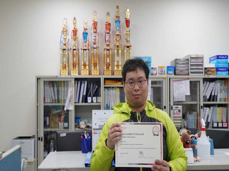 洪子恩說,大四因受資工系副教授歐陽雯的啟發與鼓勵,對資料庫管理產生高度興趣,就到資管系接受甲骨文資料庫管理師的專業培訓,並修讀3門Oracle School專業課程,也順利考取中華大學創新產業學院高階資料庫管理碩士在職學位學程,繼續鑽研Oracle專業知識,終於在去年底順利考取高難度的甲骨文2019資料庫管理師OCP專業證照。