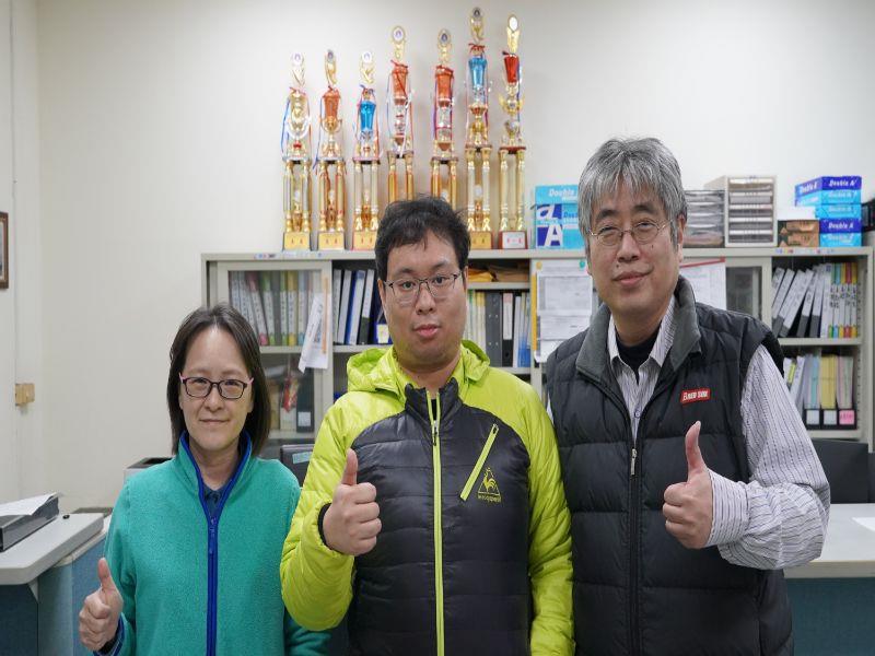 中華大學創新產業學院高階資料庫管理碩士在職學位學程主任李之中(右)與資工系主任石昭玲(左),都為洪子恩(中)能考取高難度專業證照感到開心。