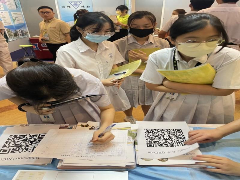 馬來西亞永平中學李保康校長(左)陪同當地學生及家長參訪元培在柔佛教育展攤位,由元培陳麗環副國際長(右二)接待
