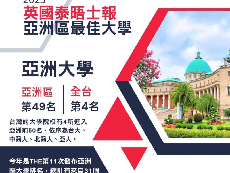 英國泰晤士報高等教育特刊公布「亞洲區最佳大學」排名,亞洲大學擠進前50強;亞大榮獲亞洲區第49名,全台第4名。