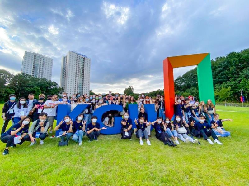 國際企業系施郁琪、易子云及時尚經營系劉馥蓉與資訊科技系莊銘哲在日本京畿大學與國際生合影