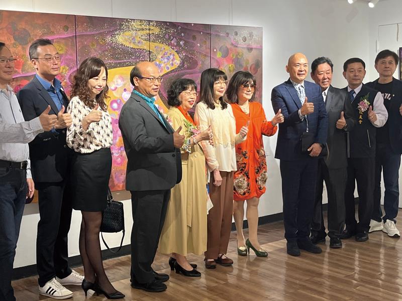 「總裁畫家」江屘菊(左五)、嶺東中學董事長蔡寶倫(右六)與校友會陳永豐理事長(左四)等嘉賓於銀河球系列作品前合影