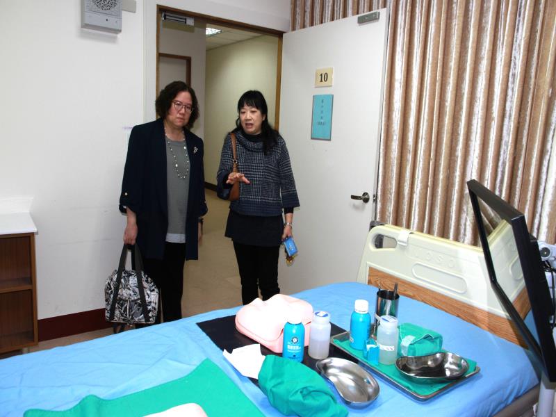 詠棠文蕙慈善公益信託周文蕙女士(左)由元培護理系徐敏芳副主任陪同參訪專業教室
