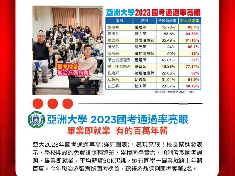 亞洲大學2023年畢業生國考通過率高,10項通過率均高於全國平均值。