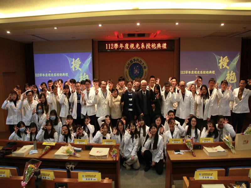 授袍儀式共有42位學生參加,由梁可嘉代領同學們宣誓,以成為視光界驗光師的一份子為目標,在實習過程中用心學習,致力考上驗光師證照,奉獻所學於視覺保健產業;隨後逐批上台接受師長們授袍,也獻花感謝師長們,在大合照時更自信地比出視光系招牌手勢,象徵用專業守護民眾視力健康、我OK,結束簡單隆重的授袍儀式。