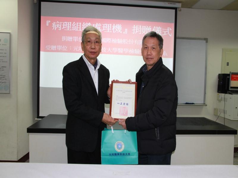 元培副校長蔡世傑(左)感謝校友久益國際檢驗股份有限公司郭正德董事捐贈病理組織處理機 輔助醫技系學生學習