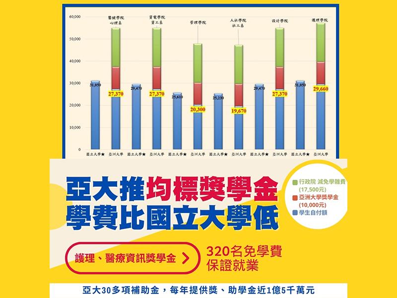 亞洲大學為幫助學生能夠在求學過程都能平權受教,除搭配政府輔助私立大學學生每年3萬5千元學雜費,亞大再加碼「新生均標以上獎學金」每學年2萬元嘉惠學子,不僅能夠減輕學子的負擔,學雜費更比國立大學還低。