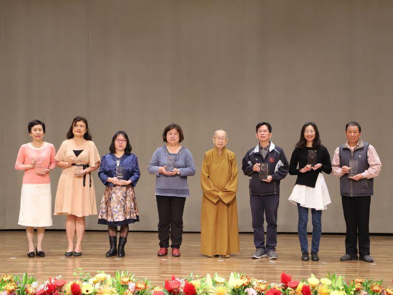 南華大學舉辦創校28週年校慶暨校歌發表會,頒發教職員工年資滿25年教職員工獎。由董事長慈惠法師(右4)頒獎。