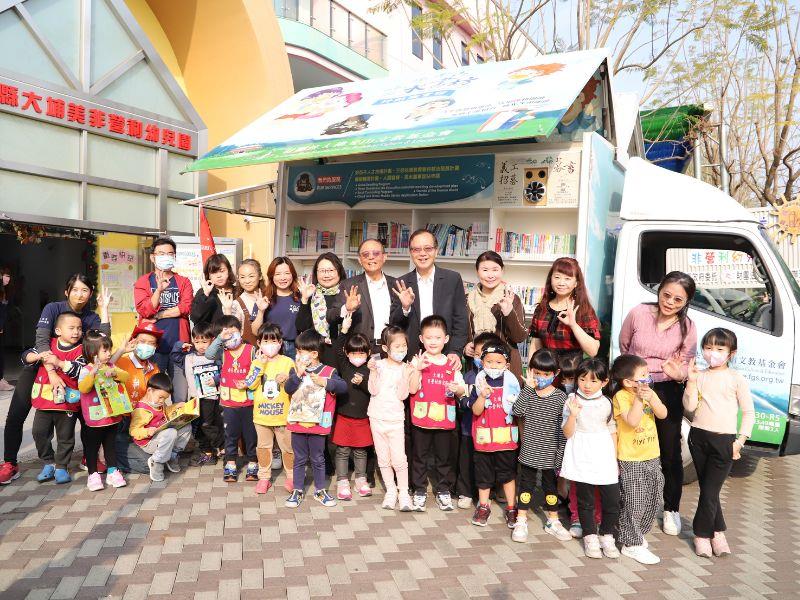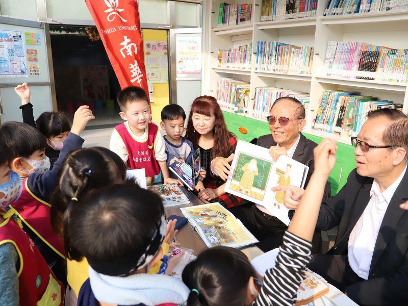 南華大學於大埔美非營利幼兒園舉辦「雲水書車趴趴走成果展」,林聰明校長(中)、林辰璋副校長(右)為小朋友說故事,左為幼教系助理教授盧?珠老師。