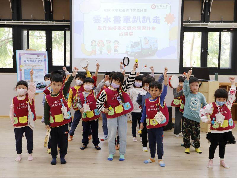 南華大學於大埔美非營利幼兒園舉辦「雲水書車趴趴走成果展」,大象班小朋友打擊樂表演。