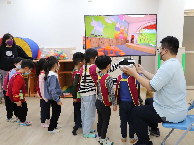 南華大學於大埔美非營利幼兒園舉辦「雲水書車趴趴走成果展」,體驗虛擬實境圖書館,走進自己創作的繪本。