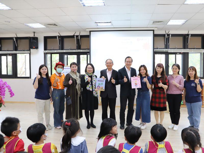南華大學於大埔美非營利幼兒園舉辦「雲水書車趴趴走成果展」,林聰明校長(左5)、林辰璋副校長(右5)致贈AR繪本予劉惠君執行長(左4)及賴淑玉園長(右4)。