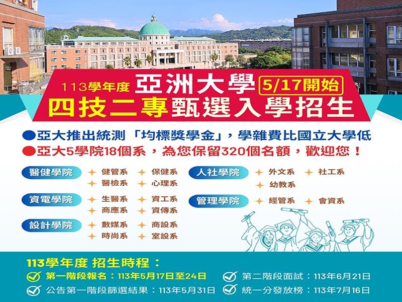 亞洲大學今年提供320位招生名額,加碼獎學金給參加統測的高職生。