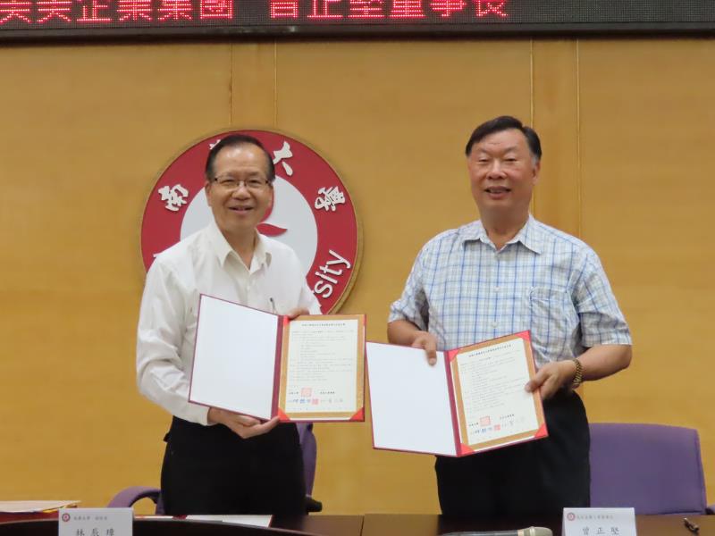 南華大學舉辦企業經營與人文講座,邀請美美企業集團董事長曾正堅(右)蒞校演講,並簽訂產學合作協定書。左為林辰璋副校長。