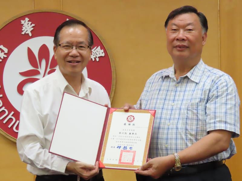 南華大學舉辦企業經營與人文講座,邀請美美企業集團董事長曾正堅(右)蒞校演講,林辰璋副校長(左)致贈感謝狀。