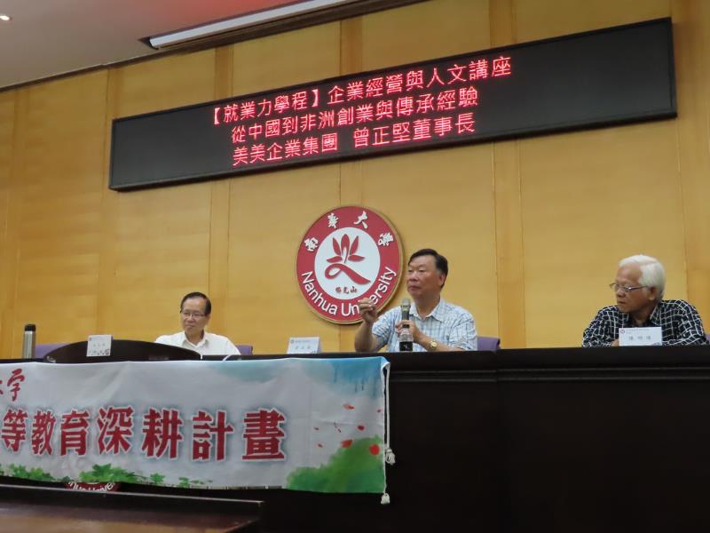 南華大學於日前舉辦「就業力學程-企業經營與人文講座」,邀請美美企業集團董事長曾正堅蒞校演講,以「從中國到非洲創業與傳承經驗」為題,分享創業理念、企業經營與傳承的經驗。