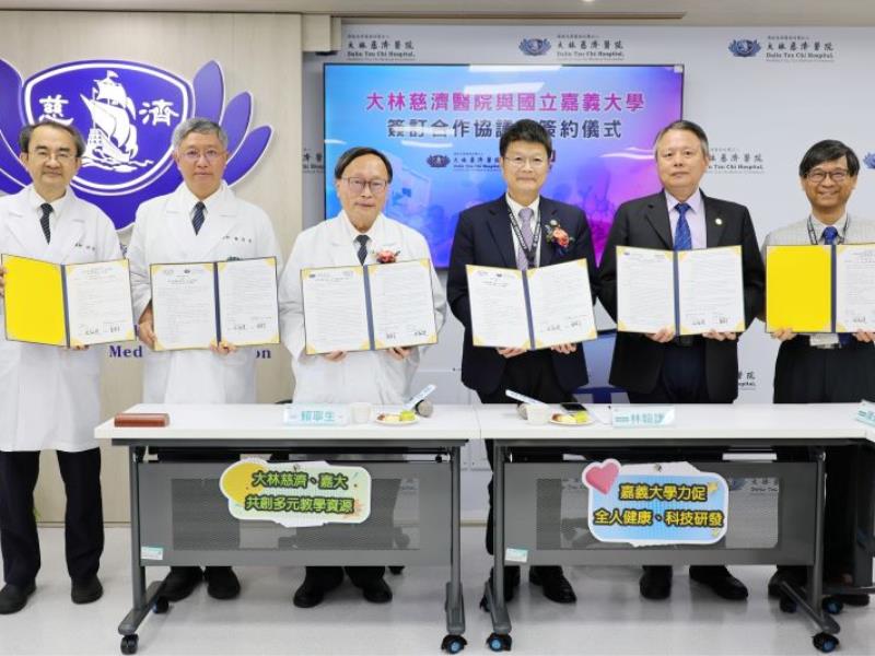 當日大林慈濟醫院由賴寧生院長、賴俊良副院長、林庭光醫務秘書、呂明錡研究部主任、李紀慧藥學部主任、李宜恭急診部主任、陳弘美教學部行政主任、陳佳蓉護理部主任、葉璧禎人文室主任及公傳室閻廣聖副主任等人出席;嘉義大學由林翰謙校長、陳瑞祥副校長、張俊賢副校長、鄭青青教務長、唐榮昌學務長、朱健松總務長、郭益銘副研發長等行政主管及師長與會。藉由此次簽約與交流活動,雙方代表針對醫學相關課程共授、專案合作、人才培育、研究設備支援共享及醫教合作等面向建立共識,並積極展開後續的合作計畫。