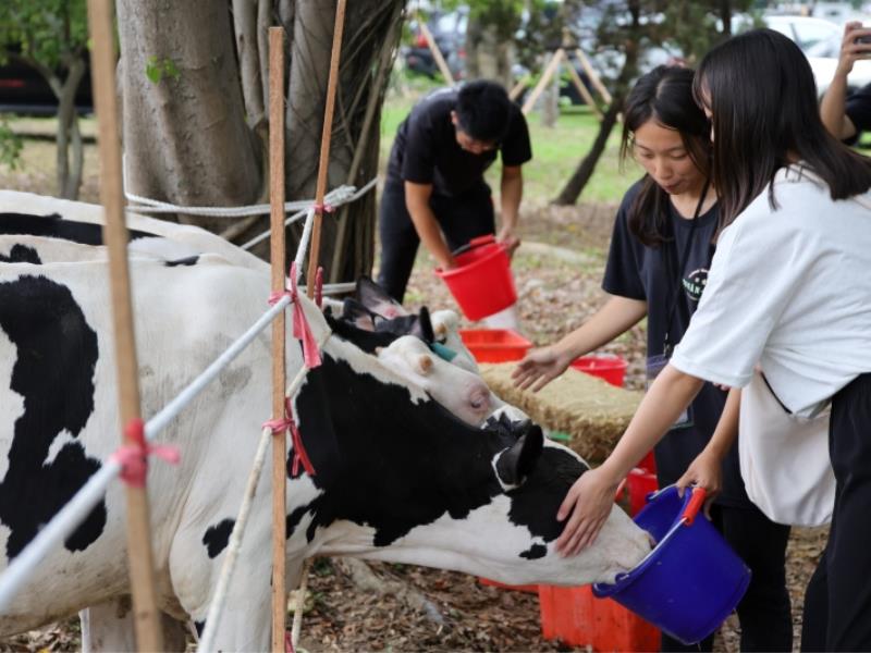 圖3:農管學程許豪俊同學遠從自家臺南善化清發牧場運來四隻小乳牛,讓參加者體驗餵牛喝奶