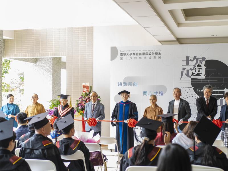 南華大學視覺藝術與設計學系畢業巡迴展壓軸場回到校內展出,進行開幕式剪綵。圖中為高俊雄校長,右4為駐校董事覺禹法師。
