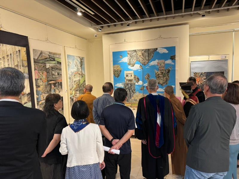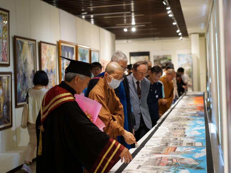 南華大學視覺藝術與設計學系畢業巡迴展壓軸場回到校內展出,總長約13公尺的水墨卷軸作品「二通遊觀圖」成為展場中的焦點。