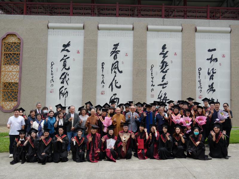 當天也頒發感謝狀給曾參賽獲獎為校爭取榮耀的同學們,師長們也一一為畢業生撥穗,祝福大家順利邁向人生的新旅程,並在星雲大師一筆字牆四句法語前合影留念。