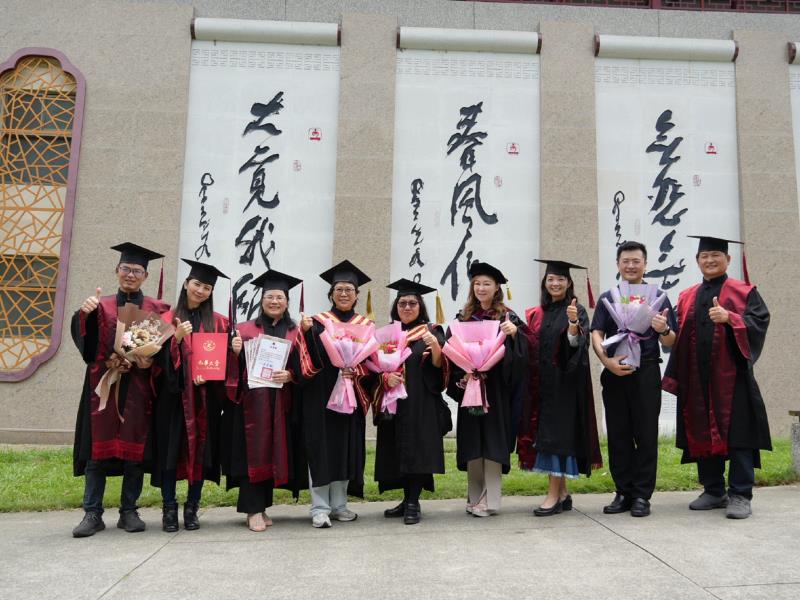 南華大學視覺藝術與設計學系畢業巡迴展壓軸場回到校內展出,開幕式當天舉辦系級畢業典禮碩士班學生與師長合影。