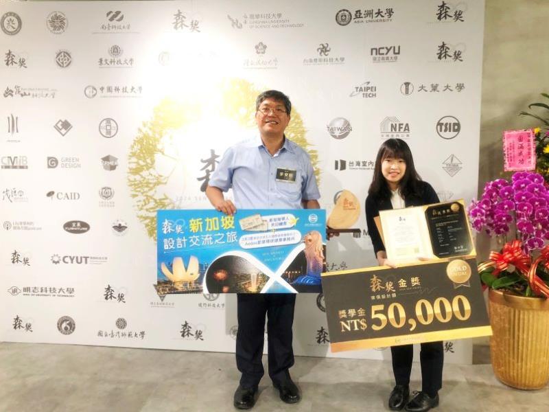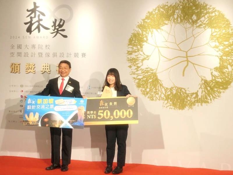圖1:嘉大木設系蕭宜亭同學(右)榮獲2024森獎「傢俱設計類」金獎,由中華民國全國商業總會常務監事王權宏頒獎後合影