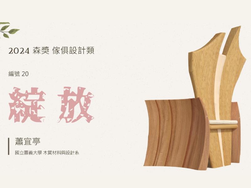 2024森獎全國大專院校空間設計暨傢俱設計競賽頒獎典禮,6月25日在臺灣科學教育館隆重舉行,嘉義大學木質材料與設計學系李安勝教授及黃瑋銓講師指導之學士班四年級蕭宜亭,以作品「綻放」榮獲「傢俱設計類」唯一金獎,獎金伍萬元,並享有新加坡設計交流之旅;另外,木設系學士班三年級張芸愷,亦為李安勝教授指導,也以「青龍·木 辦公桌」作品榮獲入選獎。