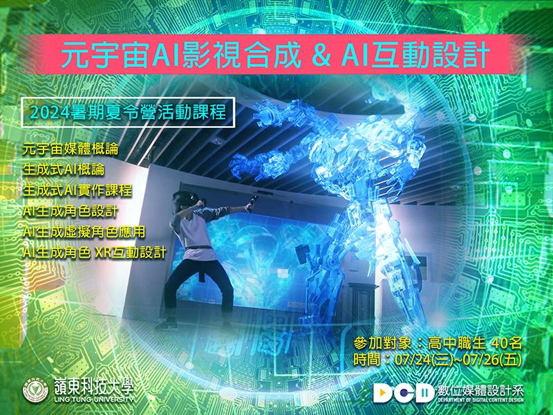 營隊活動日期為113年7月24日(星期三)至7月26日(星期五),共計3天。活動地點在嶺東科技大學(408台中市南屯區嶺東路1號)數位媒體設計系專業教室。專業課程內容包括:1.元宇宙媒體概論;2.生成式AI概論;3.生成式AI實作課程;4.AI生成角色設計;5.AI生成虛擬角色應用;6.AI生成角色 XR互動設計等。