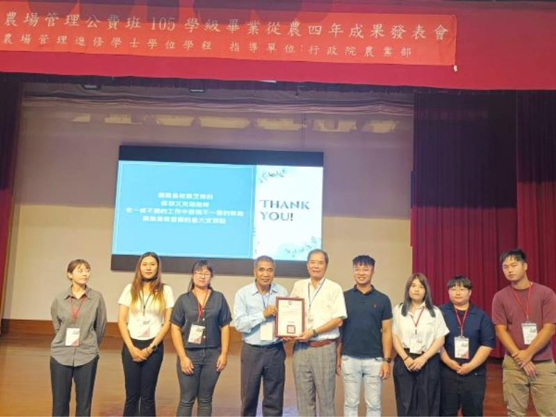 嘉義大學農場管理學士學程公費班畢業從農四年成果分享會6月29日於蘭潭校區國際會議廳舉行,邀請畢業四年之43位校友分享從農成果,展現從農之經營績效。與會貴賓有農業部農民輔導司郭愷珶科長、民雄農工鍾順水校長、彰化縣田尾鄉農會吳政憲總幹事、苗栗大湖農工園藝科蔡得康實習處主任、雲林北港農工畜保科葉金桂實習處主任、臺中新社高中農場經營科葉俊賢老師、臺南柳營區農會與彰化田尾鄉農會主任等10多位;與會之學者專家、畢業校友、在校生、專業農民及社會大眾達120多名,現場相當熱絡。