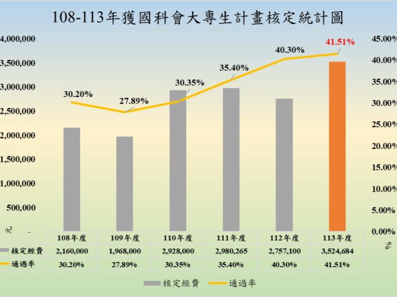 113年度國家科學及技術委員會大專學生研究計畫日前公布結果,嘉義大學榮獲1件大專生計畫創作獎;另申請國科會大專生計畫159件,通過66件,通過率達41.51%,核定金額達350萬元,通過率創近5年新高,其中有超過六成計畫另獲耗材補助。各學院表現以理工學院通過20件計畫為最多,其次為生命科學院14件;其中通過生科處及人文處各23件居多;並有5位二年級學生首次申請即獲核定通過,成績十分亮眼。