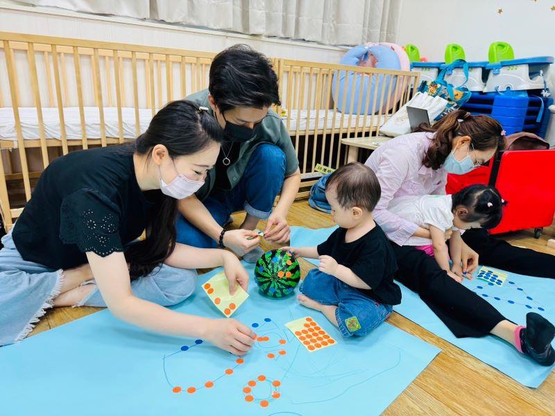 家園有五位小朋友將陸續在七月之後從家園離托,進入幼兒園就讀。家園結合新生家長說明會,6月29日辦理新、舊生家長的親子音樂律動講座,邀請屏東科技大學幼兒保育系鄭伊恬助理教授主講「形狀國王探險去」,結合有趣的繪本故事和音樂律動,以唸謠、歌唱和音樂故事帶領親子進行互動遊戲,教導家長如何運用家中隨手可得的紙張、筷子、積木等物品,跟孩子一起進行音樂遊戲。遊戲過程中,以「收拾歌」帶領幼兒玩「收拾」遊戲,幼兒聽到歌曲、看見輕放樂器到收拾籃的情境,透過聽覺和視覺的結合,引導幼兒模仿收拾玩具的動作,讓收拾玩具變成好玩的遊戲,形塑良好的學習與生活習慣。