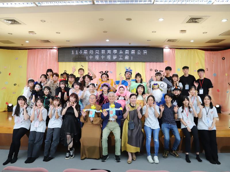 南華大學校務評鑑通過效期六年,圖為高俊雄校長(前排中)參加幼教系畢業公演關心學生的學習成果。