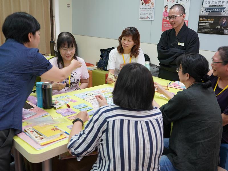 南華大學終身學習學院師資郭慧娟老師(左一)擅長以桌遊、創意有趣方式輕鬆聊生死,圖為之前辦理生死教育桌遊帶領師資班上課情形。