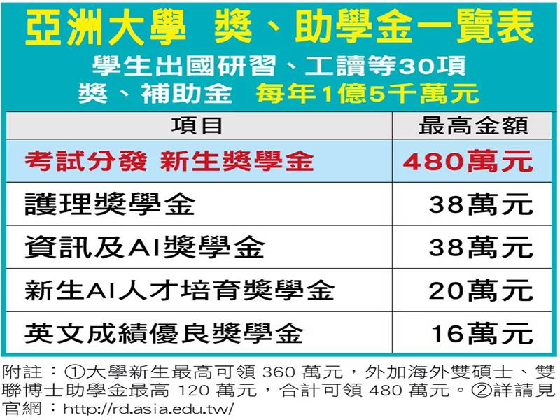 此外亞大今年加碼「護理獎學金」、「資訊及AI獎學金」,每人每年9.5萬元、4年領38萬元,共320名,且均保證就業。還有英文成績優良獎學金10萬元,鼓勵相關領域優秀學選讀亞大。